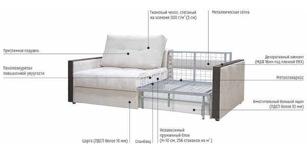 Благодаря металлокаркасу в основании диван легко передвигать, перевозить, собирать и разбирать. При раскладывании механизма получается комфортное двуспальное место с полноценным матрасом, идеально подходящее для ежедневного сна.