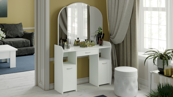 Помимо внешней привлекательности стол оснащен большим зеркалом с поворотными зеркальными створками, вместительную столешницу под которой располагается выдвижной ящик, открытые ниши для хранения и секции с дверцами, где можно разместить все необходимые аксессуары и косметику. Удобные отсеки помогут поддерживать порядок и удобство в Вашем уголке красоты.