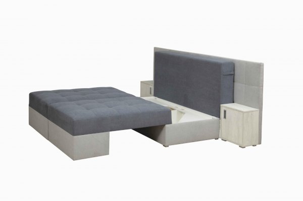 Даллас совмещает функционал кровати, прикроватных тумб и практичность дивана в одной модели. Стильно, практично, функционально и просто необычно! Половинки дивана соединяются к середине при помощи механизма трансформации «ножницы», легко фиксируясь между собой, образуют полноценное место двуспальной кровати 2000х1500 с пружинным матрасом, с декорированной утяжками мягкой прикроватной спинкой и двумя открывающимися тумбами, ручки открывания тумбочек оформлены в цвете матовый хром.