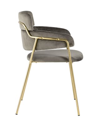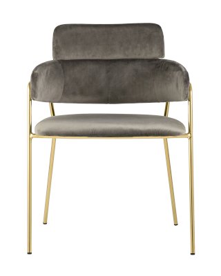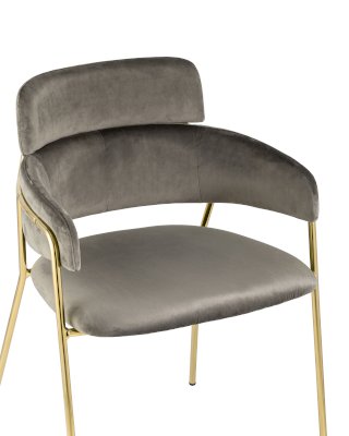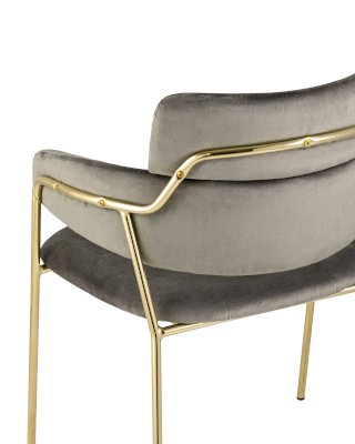 Стильный стул с оригинальной спинкой и подлокотниками. Металлический каркас золотого цвета огибает спинку и выступает аккуратным акцентом модели. Широкое сиденье обеспечивает удобную посадку.
