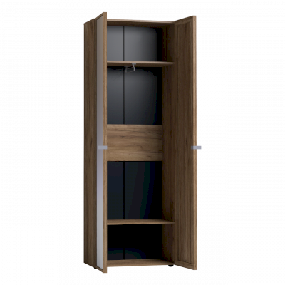 Двухдверный распашной шкаф легко открывается за ручку-петлю из микрофибры, которая устанавливается на одном зеркальном фасаде, другой - открывается за рамку. Шкаф комплектуется выдвижной штангой и двумя нишами сверху и снизу. Корпус шкафа выполнен в декоре Дуб Табачный. Регулируемые опоры компенсируют неровности пола.