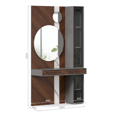 • Модуль скомбинирован из наборной панели с зеркалами, шкафа одностворчатого и стола с выдвижными ящиками