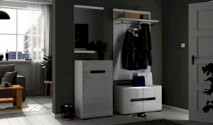 Вешалка представляет собой вертикальный щит, на который крепятся полка, металлическая составная вешалка и металлические крючки. На верхней части вешалки крепится планка декоративная из МДФ в цвете "Белый блеск". Вешалка  крепится на стену при помощи кронштейнов. Максимальная нагрузка на вешалку до 5 кг На полке вы сможете разместить головные уборы, шарфы и т.д.
