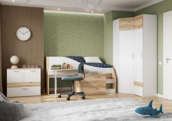 Сверху антресоль, открывается вверх на газлифте. Внутри четыре полки. Внизу два ящика (один большой, второй маленький (по ширине цветной вставки, без ручки). Направляющие НПВ шариковые.