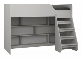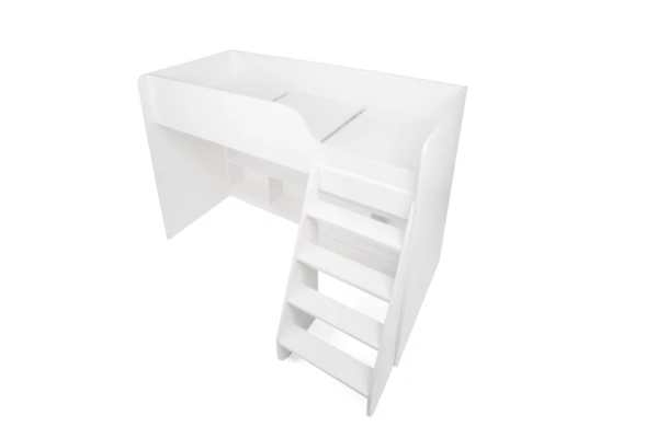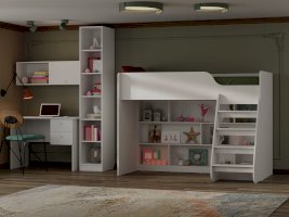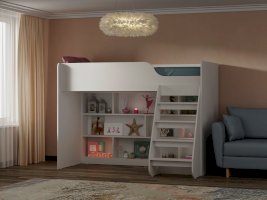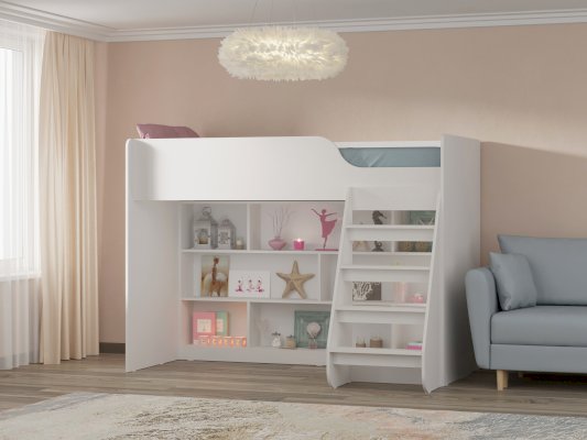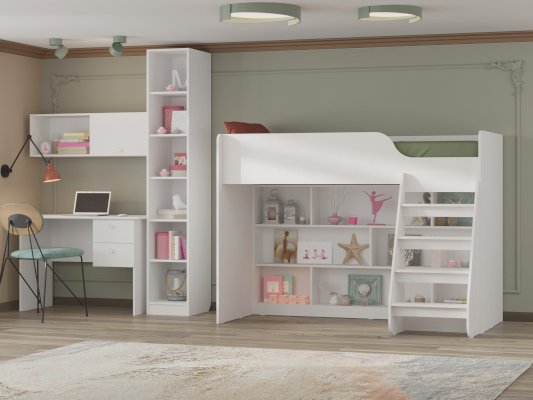 Множество полок предоставляют  места для хранения игрушек, книг и других вещей, необходимых для ребенка. Плавные линии,  выглядят красиво и современно, обеспечивают безопасность ребенку. Детская кровать, расположенная сверху, оборудована бортиками безопасности.