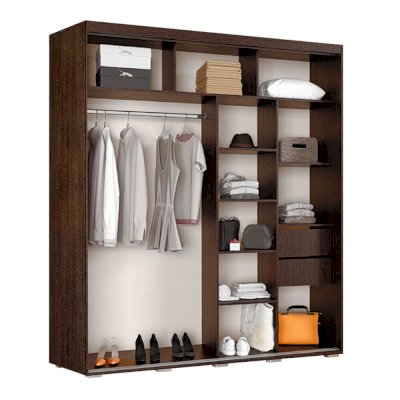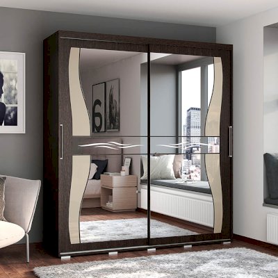 Практичный и многофункциональный шкаф-купе Крафт-5 подойдет для любой комнаты вашей квартиры или дома. Две большие створки на роликовых направляющих выполнены в темном цвете венге и имеют зеркальные вставки. Модель состоит из многочисленных полок и ящиков для белья и одежды, а также отделения со штангой для плечиков. Наличие зеркал позволит визуально расширить пространство.