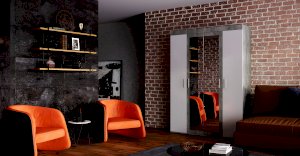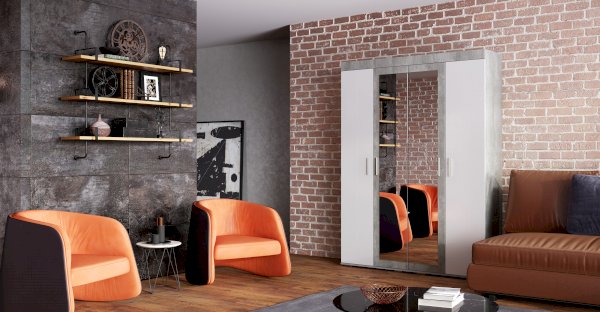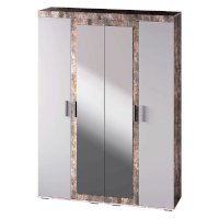 Современный четырёхстворчатый шкаф Инстайл выполнен в стиле одноименной модульной коллекции мебели. Модель состоит из четырех дверок, две из которых – зеркальные. Изделие выполнено в комбинации белого и цвета бетон. Внутреннее наполнение состоит из двух отделений со штангами, а также верхних и нижних полок для вещей. Стильный геометрические ручки украшают шкаф Инстайл.