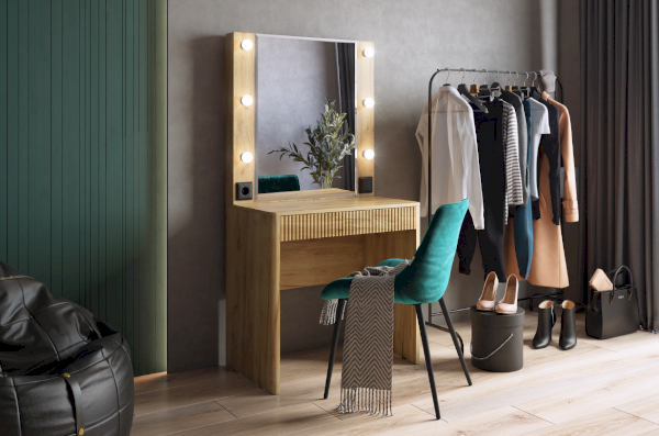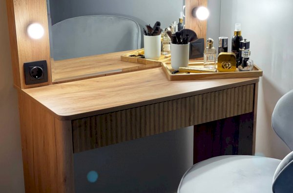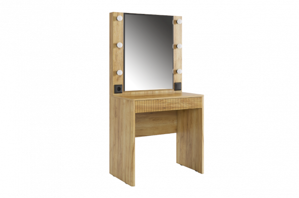 Трюмо Адам — это идеальное сочетание стиля и практичности. С широким фацетированным зеркалом, в котором встроена подсветка из 6 лампочек, оно создает атмосферу профессиональных студий визажистов прямо у вас дома. Комфорт и функциональность обеспечиваются дополнительными элементами, такими как выключатель, розетка для фена и выдвижной ящик для хранения украшений и косметики. Элегантные закругленные углы завершают дизайн, делая его идеальным дополнением к вашей спальне.