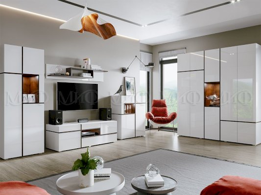 Глянцевая белоснежная гостиная делает комнату просторнее и светлее. Яркое тому подтверждение гостиная «Мадера». Любой предмет мебели в такой гостиной можно использовать как самостоятельную единицу, так как она подойдет к любому интерьеру. С помощью гостиной «Мадера» можно создать свой стиль в обстановке квартиры.