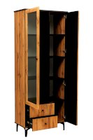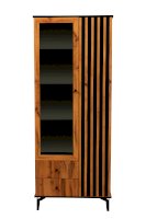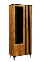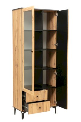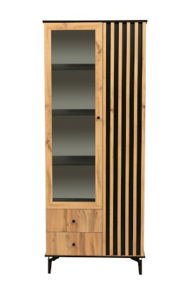 Комбинированный шкаф удачно сочетает в себе витрину, стеллаж и комод. Шкаф визуально разделен на две части. Левая – за стеклянной дверцей, которая обрамлена рамкой в цвет дерева. Правая часть – закрытая. Внутри, за дверцами, находятся полки из ЛДСП. Каждая выдерживает вес до 5 кг. За каждой дверцей – по 4 полки. Они разной ширины, так как левая часть, по традиции коллекции, шире, а правая – уже.