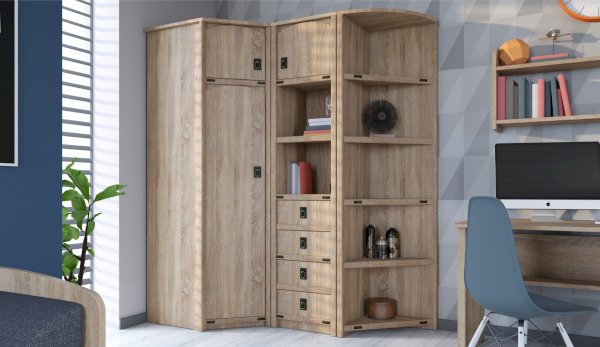 Угловой стеллаж можно поставить с шкафами и пеналами разной глубины. Имеет универсальную сборку и может располагаться, как справа, так и слева от шкафа. Открытые полки позволят разместить книги, фотографии в открытом доступе, а также украсить комнату декором. Декоративные элементы бронзового цвета стилизованы под морскую тематику. Идеально компонуется со всеми модулями системы Валенсия.