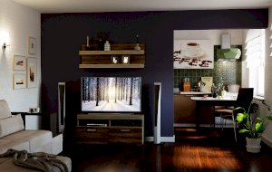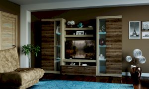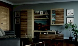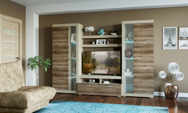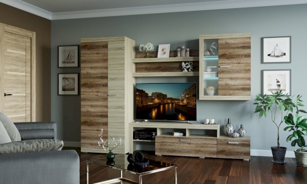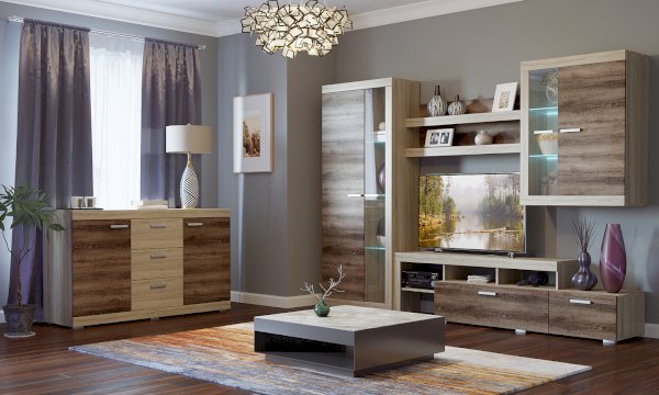 В гостиной Соната применяются современные европейские декоры: корпус выполнен из ЛДСП Дуб сонома, фасад из ЛДСП Дуб Сакраменто. Декоры отличаются выраженной тёплой древесной текстурой, а фасадная часть подчёркнута горизонтальными линиями текстуры и стильными планками МДФ, представляющими собой элементы корпуса и фасада.