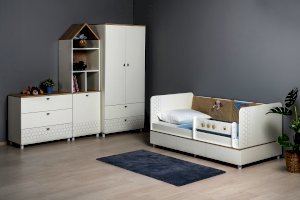 Кровать оснащена съёмным мягким элементом с карманами, передвижным бортиком и декорирована оригинальным рисунком - мультяшными пчёлками, которые никого не оставят равнодушным.