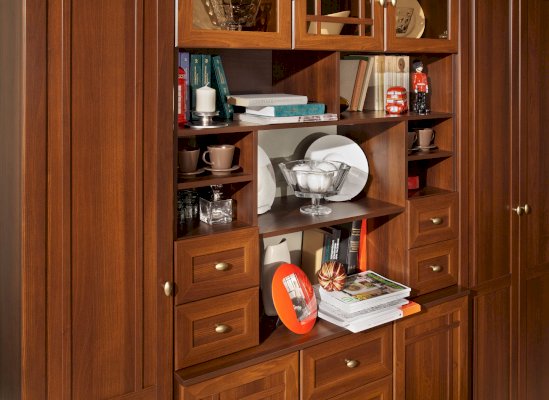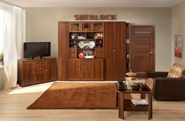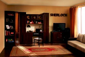 Широкий выбор модулей коллекции SHERLOCK помогает создать уютную гостиную с комфортным рабочим местом, что очень важно для маленькой квартиры. Вместительный 15 Стол письменный можно расположить между шкафами и навесить над ним 4 Шкаф навесной на любой удобной для Вас высоте. 5 Тумба МЦН – отличный вариант не только для хранения вещей, но и для размещения на ней телевизора. Шариковые направляющие тумбы обеспечивают плавность хода выдвижных ящиков. Большой выбор шкафов коллекции SHERLOCK дополнит и то, что 10 Шкаф угловой можно выбрать либо с фасадом Стандарт, либо с фасадом Зеркало. Все фасады модулей коллекции декорированы классическим переплетом из МДФ.
