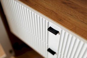 • Между стационарными перегородками два ящика друг под другом на направляющих нижнего крепления не полного выдвижения с доводчиком.