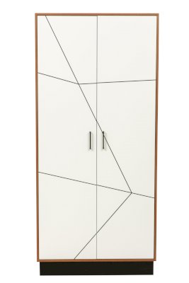 Шкаф скомбинирован так, чтобы учесть все потребности его владельца.  Левый отсек – с верхней полкой-антресолью и отделом, где хранятся вещи. Под полкой располагается металлическая штанга для вешалок. Отличительная особенность шкафа – он достаточно узкий, его глубина составляет 360 мм, поэтому штанга расположена посередине – в виде подвеса, а вешалки располагаются не «в профиль, а анфас». Высота шкафа позволяет развесить вещи разной длины – начиная от коротких рубашек и футболок и заканчивая длинными вечерними платьями в пол.   Правый отсек представляет из себя набор из пяти полок, на которых размещаются сложенные вещи. Каждая из полок выдерживает до 5 кг – это более, чем достаточно.