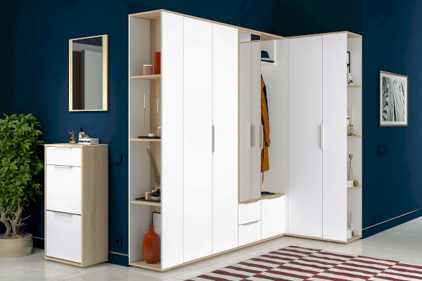 Внимание! У шкафа открывается только одна створка. Шкаф по размерам является полноценным двухстворчатым шкафом. Однако благодаря своей конструкции, он идеально подойдет для маленьких прихожих, поскольку ему нужно мало места для открывания.