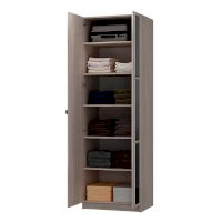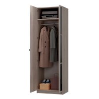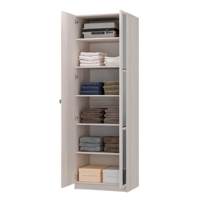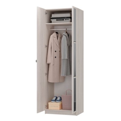 Данный шкаф имеет две распашные створки: на одной наклеены 3 зеркала с фацетом, вторая створка глухая. Данная модель идет в комплекте со штангой. По желанию, Вы можете заменить штангу полками. Полки приобретаются отдельно.