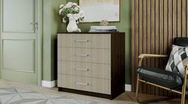 Модель комода Фиеста позволит разместить ваши любимые вещи благодаря четырем выдвижным ящикам. Изделие будет идеально смотреться в любом интерьере и любой комнате, ведь оно выполнено из ЛДСП классических цветов венге и лоредо. Пользоваться комодом очень удобно за счет эргономичных ручек.