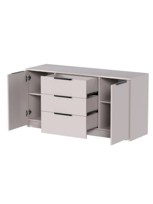 Наполнение: 3 выдвижных ящика + 2 распашные дверцы. За дверками расположено по 2 полки.