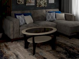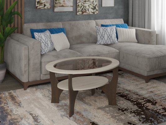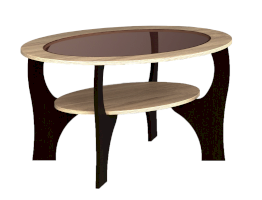 Стол журнальный станет прекрасным украшением интерьера. Столешница оснащается вставкой из тонированного стекла. Фигурные ножки прикрепляются к столешнице и небольшой круглой полочке.