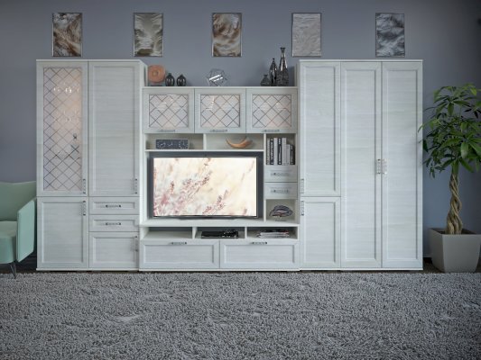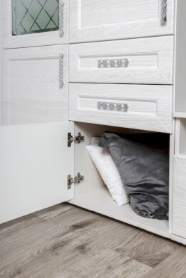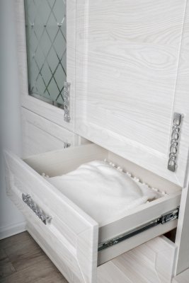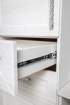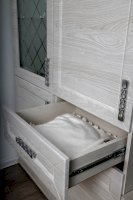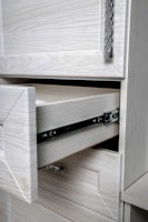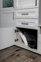 За закрытыми дверками расположены вместительные полки, два выдвижных ящика полного выдвижения, дополняют как внешний вид, так и добавляют дополнительную функциональность модулю.