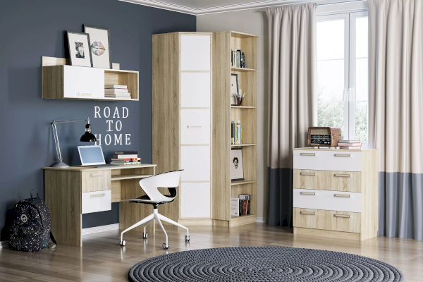Шкаф «Фанк» предназначен для тех, кто любит выдержанный стиль. Идеально для организации подростковой комнаты. А универсальный дизайн и цветовое решение подойдет как для мальчика, так и для девочки. С угловым шкафом «Фанк» получится максимально использовать пространство в комнате, задействовав место в углу. Внутри модуль разделен на две функциональные зоны. Секция с пятью полками подходит для хранения одежды в сложенном виде, а на штанге в другой половине шкафа можно разместить одежду на вешалках-плечиках. Широкая полка, расположенная над штангой, удобна для хранения коробок.
