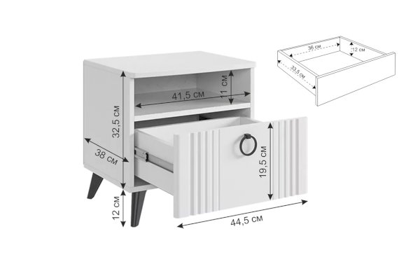 Размер прикроватной тумбы: ШхГхВ 450х428х446 мм