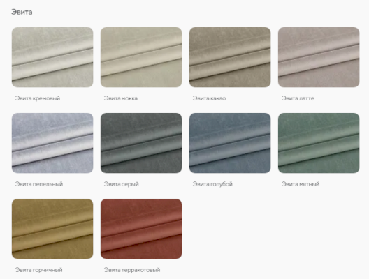 | Цвет | БЕЖЕВЫЙ / БЕЛЫЙ / ГОЛУБОЙ / ЗЕЛЕНЫЙ / КОРИЧНЕВЫЙ / РОЗОВЫЙ / СЕРЫЙ / СИНИЙ / СИРЕНЕВЫЙ / ЧЕРНЫЙ / КОФЕ |