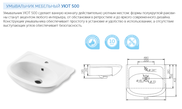 Название коллекции УЮТ говорит само за себя: она сделает ванную комнату по-настоящему уютной одним своим присутствием. Мягкие, спокойные округлые формы мебельных умывальников станут прекрасным дополнением любой ванной комнаты, придав обстановке завершенный вид. На высшем уровне находятся и эксплуатационные качества сантехники. Сделанная из прочного, привлекательно выглядящего и не теряющего со временем своего безупречного внешнего вида санитарного фарфора сантехника устойчива перед воздействием абразивных и содержащих щелочи моющих средств.