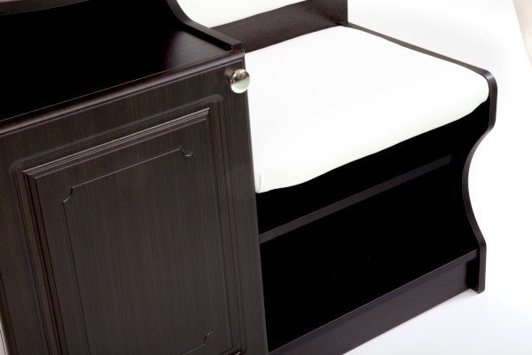 Банкетка выполнена в классическом стиле. Удобные полки и ящики добавляют ей функциональности.