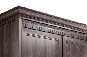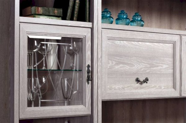 Фасады: МДФ, зеркало с фацетом, прозрачное стекло с фацетом и гравировкой; декоративные вставки с фигурной фрезеровкой: МДФ в пленке ПВХ с эффектом патины