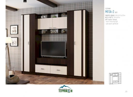 Гостиная «Муза-2» — это элегантная мебель для практичных людей. Благодаря надежной и рациональной конструкции гарнитур очень удобен в эксплуатации. Покупателям также нравятся качественная стилизация под натуральную древесину, гармоничное сочетание двух естественных оттенков и неброская фурнитура. Особый шарм модели придают открытые полочки, на которых можно разместить сувениры.
