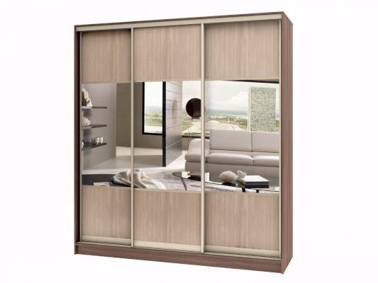 Данное изображение представлено в следующих цветах: корпус - Ясень Шимо тёмный, фасады - Ясень Шимо светлый и зеркало, рамка двери и треки - Шампань матовая.