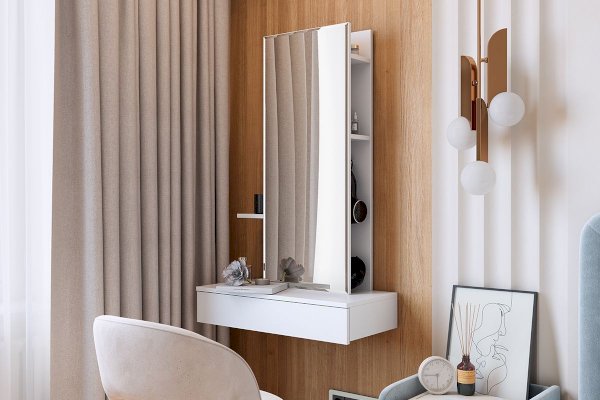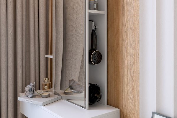 Сборка у трюмо универсальная. Зеркальную панель с полками можно установить ближе к левому либо ближе к правому краю. Так же полки за панелью крепятся в разных положениях.
