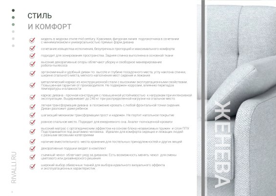 Прямой диван Женева (Rivalli) - за 103 731 руб. в Сергиевом Посаде. Купите на сайте sergiev-posad.onlinemarketmebeli.ru или по телефону 8(800)505-30-63 уже сегодня! Уточнить наличие, комплектацию, актуальную цену можно бесплатно у менеджера ежедневно. Закажите Прямой диван Женева (Rivalli) до конца акции! Доступна покупка в кредит, рассрочку. Доставим со склада или на заказ.