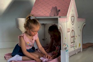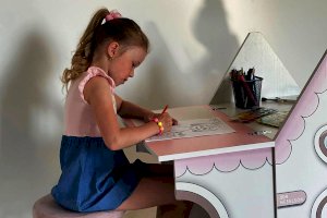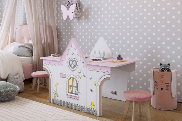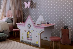 Стол раскладной займет мало места в комнате. Крыша домика легко раскладывается и превращается в стол, как для 1 ребенка, так и для 2-х детей. Так же может служить местом для игры в куклы, в прятки и другие всевозможные забавы. При закрытой крыше- это прекрасный стеллаж для хранения предметов творчества.