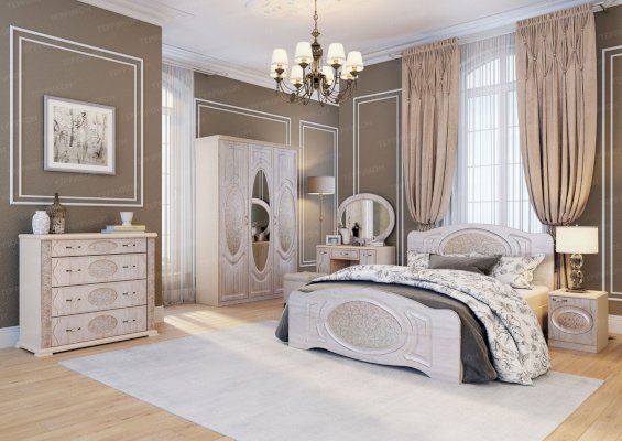 Окружите себя изысканностью французского поместья — купите спальный гарнитур «Прованс-2»! Стилизованная под старину и роскошь мебель очаровывает романтиков и эстетов. Атмосферу нежности и покоя создают натуральные цвета и текстура отделки, плавные линии изголовья и изножья кровати, овальное зеркало и закругленные декоративные фигуры на фасадах.