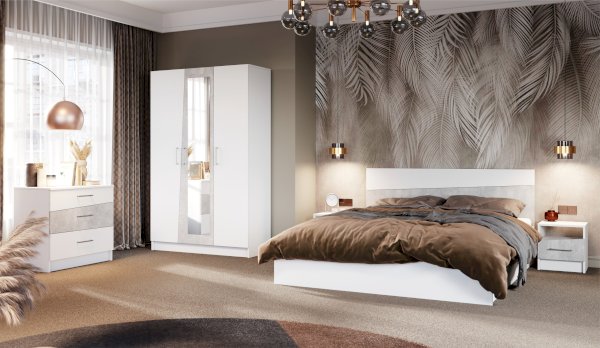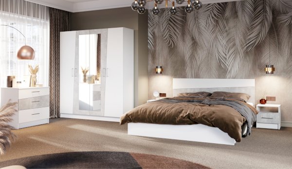 Кровать Антария – акцент спальни, выполнена в стиле минимализм, удобна и просторна, можно с комфортом проводить свободное время. Комбинированное изголовье из ЛДСП с асимметричными скошенными линиями вносит свободу и движение в жилое пространство, делает интерьер более сложным и необычным. Надежное и крепкое основание кровати выполнено из ламинированной плиты – гарантирует отличную вентиляцию и подойдет для любителей спать на жестком матрасе.