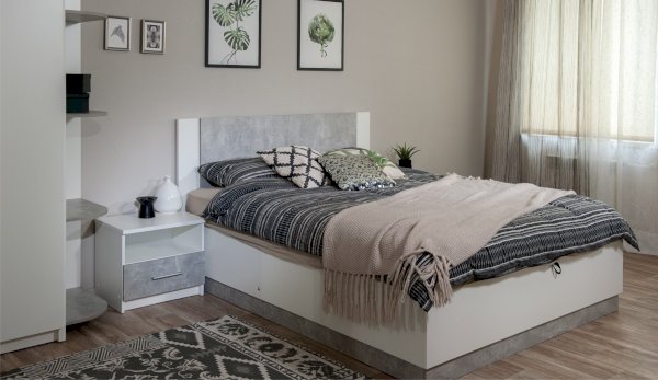 Кровать Аврора - акцент спальни, выполнена в стиле минимализм, удобна и просторна, можно с комфортом проводить свободное время. Изголовье - комбинированное, с декоративной вставкой контрастного цвета по центру. Кровать с надежным ортопедическим основанием с подъемным механизмом на газлифтах, внутри расположены две секции для хранения подушек, одеяла и любых других вещей.