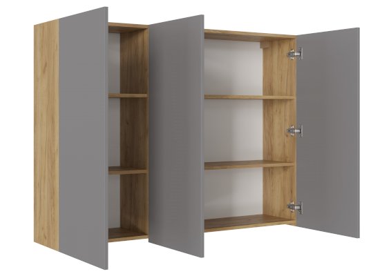 Шкаф поделен на 2 части: первая часть закрывается одним фасадом, внутри расположены 2 съёмные полки с возможностью перестановки их по высоте (шаг 32 мм). Вторая часть закрывается двумя фасадами, также имеет 2 съёмные полки с возможностью перестановки их по высоте с шагом 32 мм. Дверца открывается за выступающую часть створки.