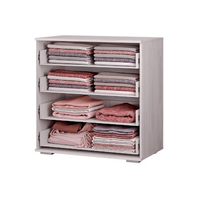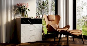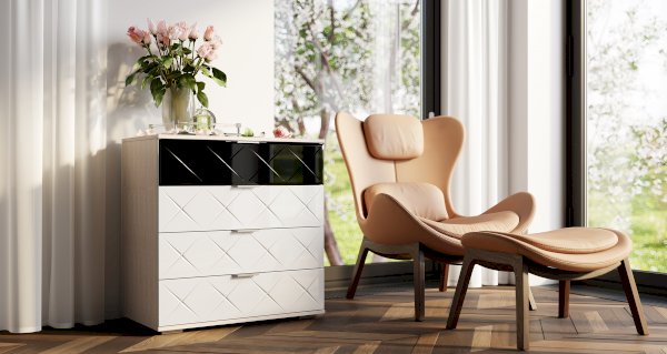 Комод Кимберли выделяется своим необычным дизайном, а именно черным фасадом верхнего ящика и стильными эргономичными ручками. Корпус модели выполнен в цвете светлого ясеня, а фасады оставшихся трех ящиков отделаны белым глянцем. Размеры комода позволяют разместить все необходимые вещи.