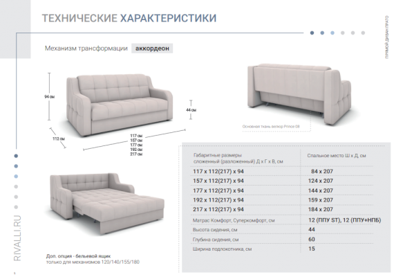Несколько типоразмеров позволяют подобрать идеальный диван для помещений любых размеров. Дополнительно к модели можно приобрести бельевой ящик. Также модель прекрасно смотрится, если украсить ее простыми декоративными подушками, которые можно заказать в тон дивану или из контрастной ткани с весёлым рисунком.