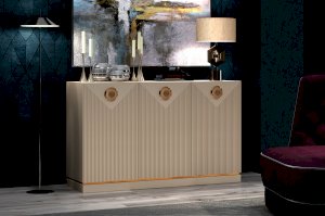 Комодино отличает нарядный внешний вид. Сочетание кремовых оттенков ЛДСП и МДФ в цвете сатин, золотой кромки в основании корпуса и яркой металлической лицевой фурнитуры создает незабываемый нежный образ мебели в стиле модерн.