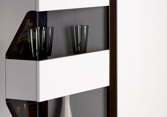 • Благодаря глянцевым фасадам и двухсторонним стеклянным витринам шкафов с подсветкой мебель «добавит воздуха» небольшой комнате