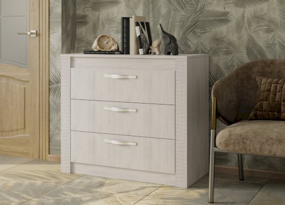 Комод Монако выполнен в сдержанном и элегантном стиле, как и все модели из одноименной мебельной коллекции. Изделие изготовлено в светлом цвете белого ясеня из качественной ЛДСП и имеет декоративные вставки из МДФ. Расположить вес необходимые вещи можно в трех выдвижных ящиках, дополненных эргономичными ручками.