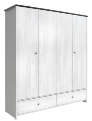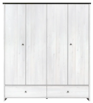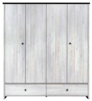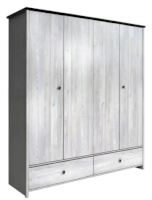 Шкаф разделен на 3 отделения. Внутри шкафа 2 полки и стационарные металлические штанги для одежды. С правой стороны – за распашной дверью отделение с полками. В нижней части шкафа 2 глубоких выдвижных ящика на металлических роликовых направляющих.
