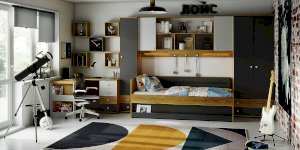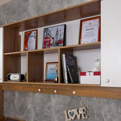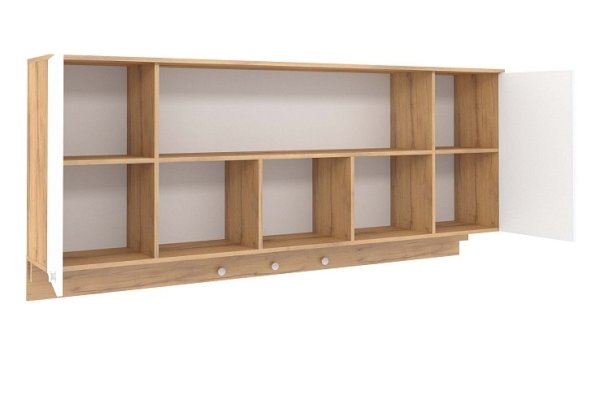 Навесные шкафы-мосты с функцией ночника привлекательны для детей и для поклонников оригинальных решений. Включается и выключается диодная подсветка ночника при помощи маленького аккуратного выключателя. Также Шкаф навесной - очень практичное решение, он позволяет рационально использовать пространство над кроватью, объединяя в себе ниши, полочки и шкафчики за глухими фасадами. Белые ручки на пристенной панели играют роль крючков-гвоздиков для возможности декорирования зоны отдыха ребенка. Обращаем ваше внимание на то, что 81 Шкаф навесной обязательно крепится к стене на уголки и должен быть установлен и дополнительно закреплен между двумя высокими шкафами. Самостоятельное его размещение на стене не рекомендуется!